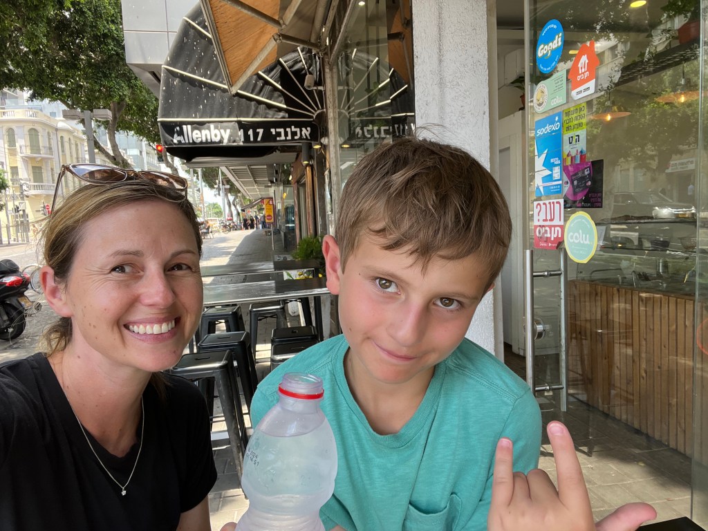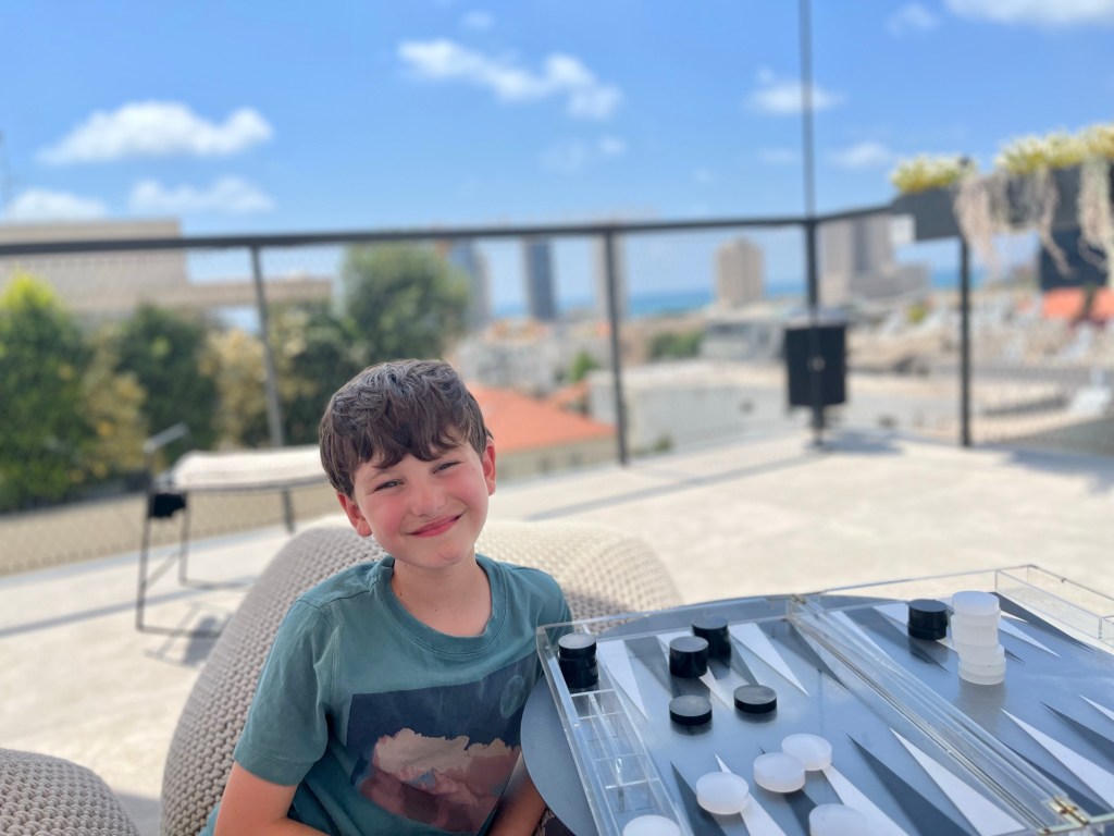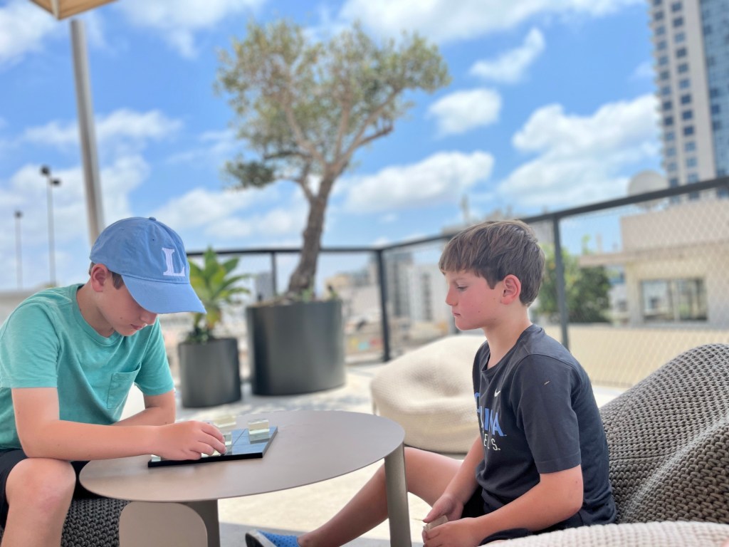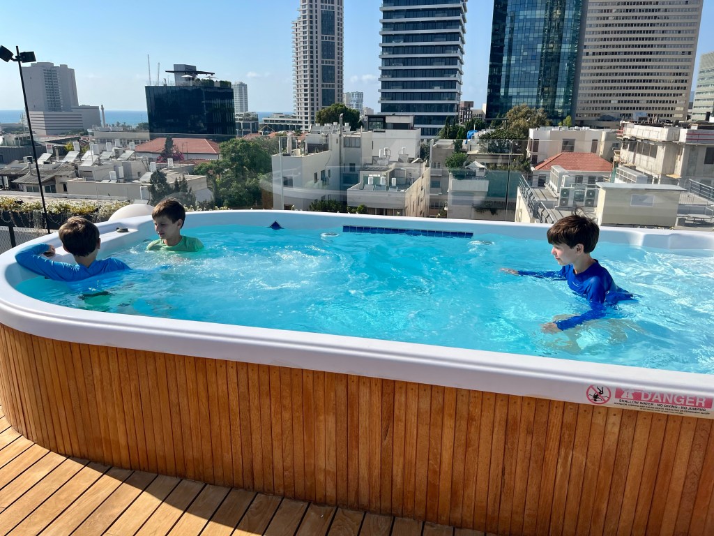 When we first floated the idea of moving for a year, the kids were resistant (naturally). One day they were talking about water parks and so we suggested that we would probably come across many water parks during our travels. We committed that we would intentionally seek out water parks along the way and that helped them come around to the idea of moving abroad. We needed to fulfill this promise somewhat early in our year so today we went to Shefayim Park just north of Herzliya. Box officially checked. At least for now. We came back to Tel Aviv for some swimming and relaxing on the roof deck and David had some zoom meetings. Given the Knesset’s vote tonight on limiting judicial power, we are curious to see what Tel Aviv may look like in the morning. David returned the rental car tonight just in case roads are blocked tomorrow.