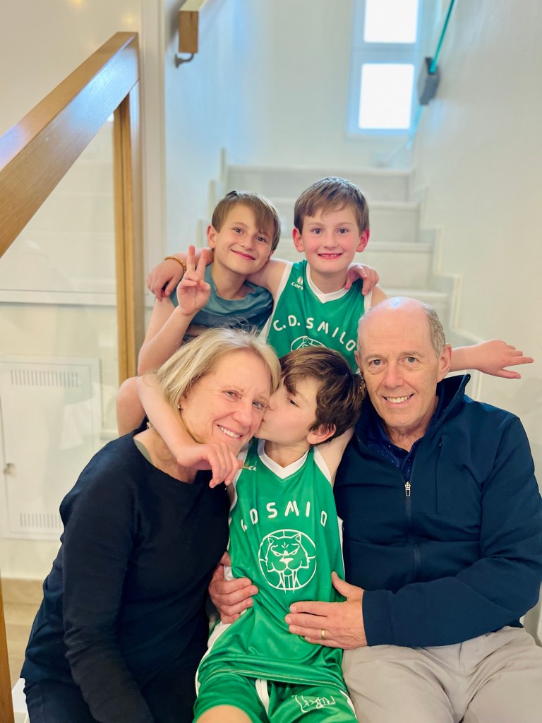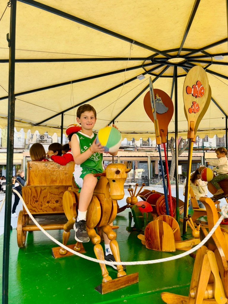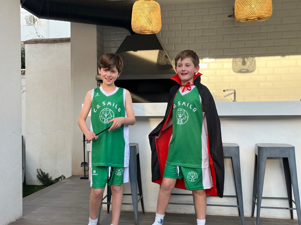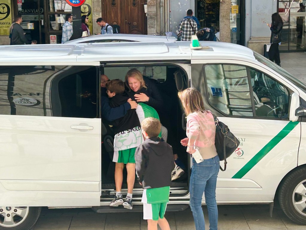 Saturday morning the kids had a blast at their basketball games and played very well. We hopped on the bus to get from Victoria Eugenia to Palacio Gran Vía eager for the arrival of Mama Sue and Poppy. While on the bus the kids hatched a plan: before the grandparents arrived, the guapos politely asked the reception staff to prank them during check in by saying they had been upgraded to the Tar Heel suite and informing them the gym was unexpectedly closed for repairs until further notice. The hotel staff nailed the delivery and we all had a good laugh. After a delicious lunch at Botánico, we walked through Bib Ramblas where Dean rode the bike-powered carousel. Back in el Realejo, Miles and Dean performed their magic/dance/acrobatics show. The grandparents needed some sleep so Julie walked them home and then those us of not jet-lagged watched the rare Heels basketball game that wasn’t way past our bedtimes.